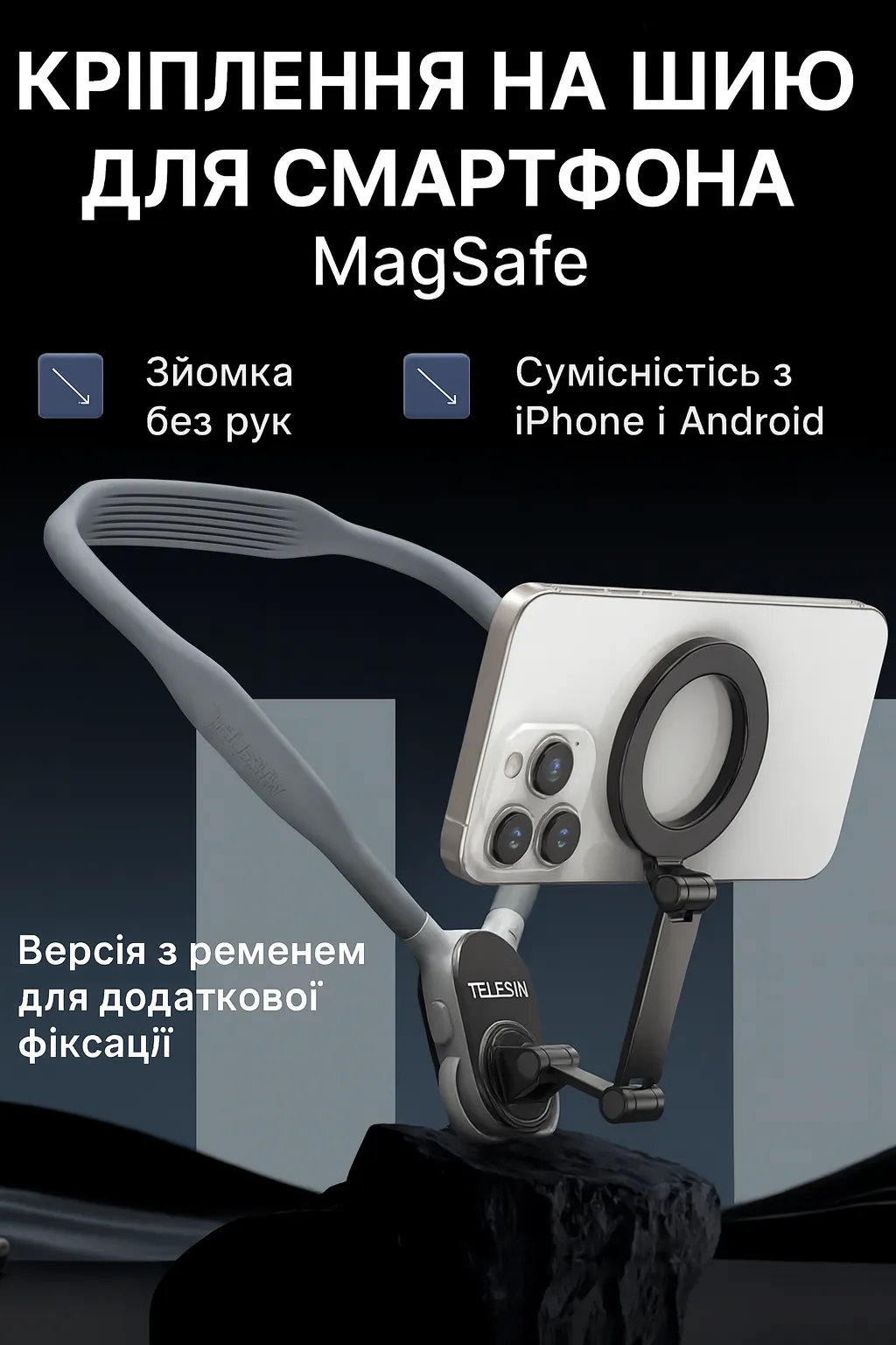Підходить для iPhone із MagSafe, Samsung Galaxy, а також будь-яких Android-смартфонів із магнітною пластиною (у комплекті). Сумісність із камерами GoPro — бонус для тих, хто знімає активні влоги.